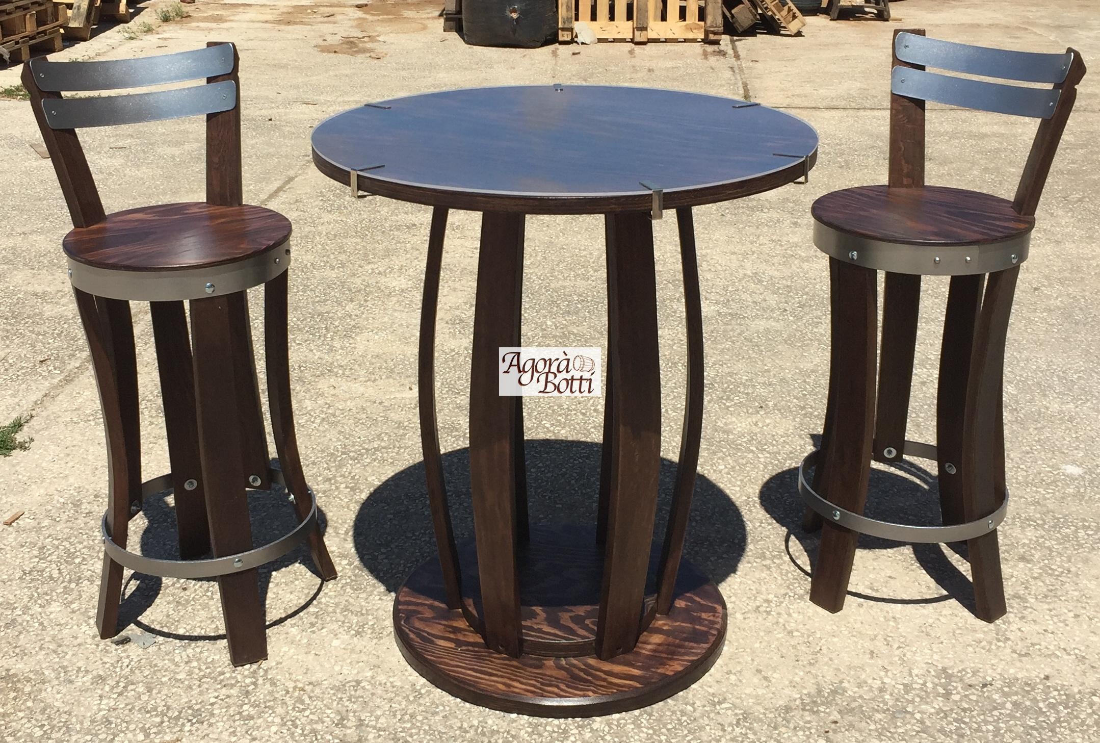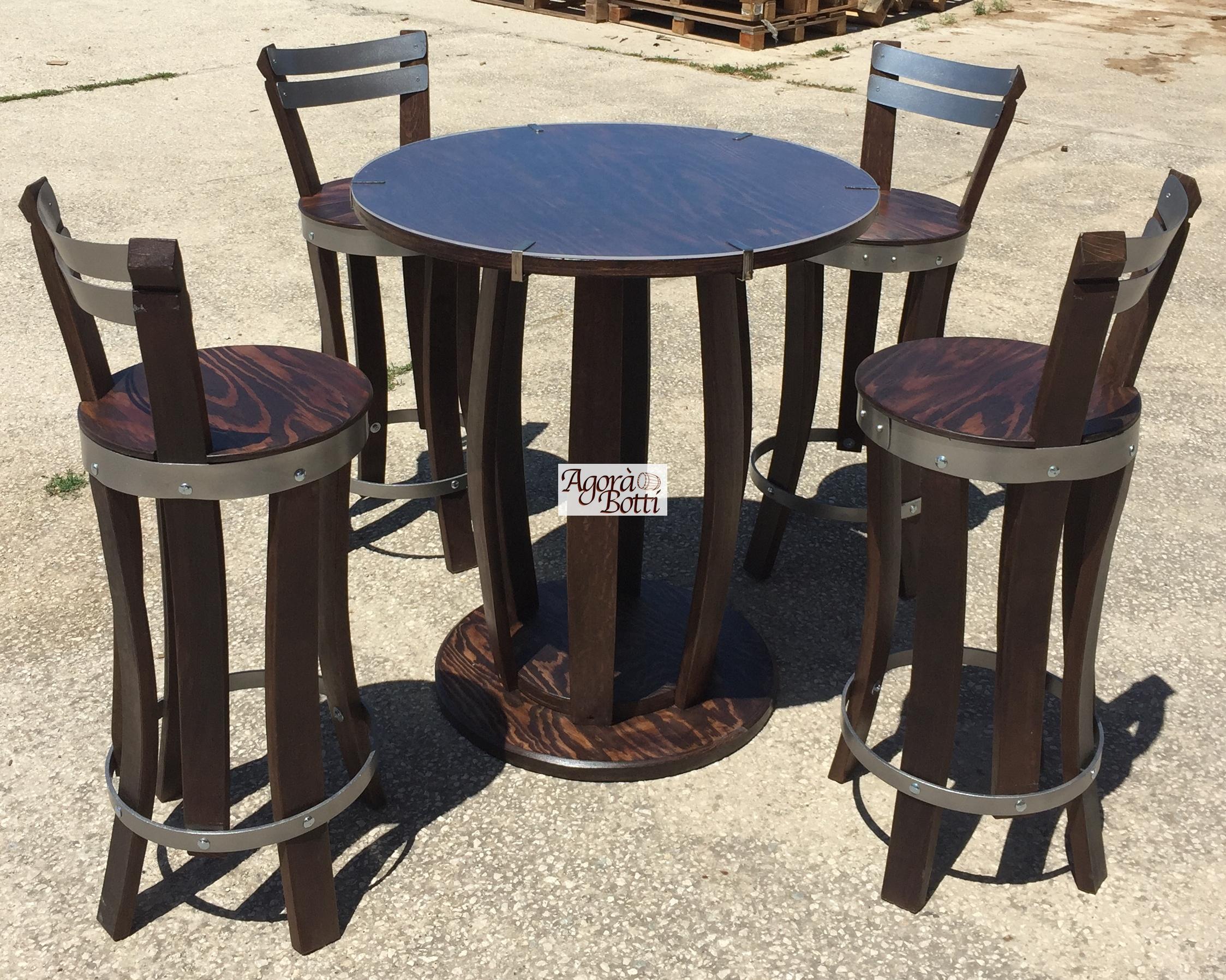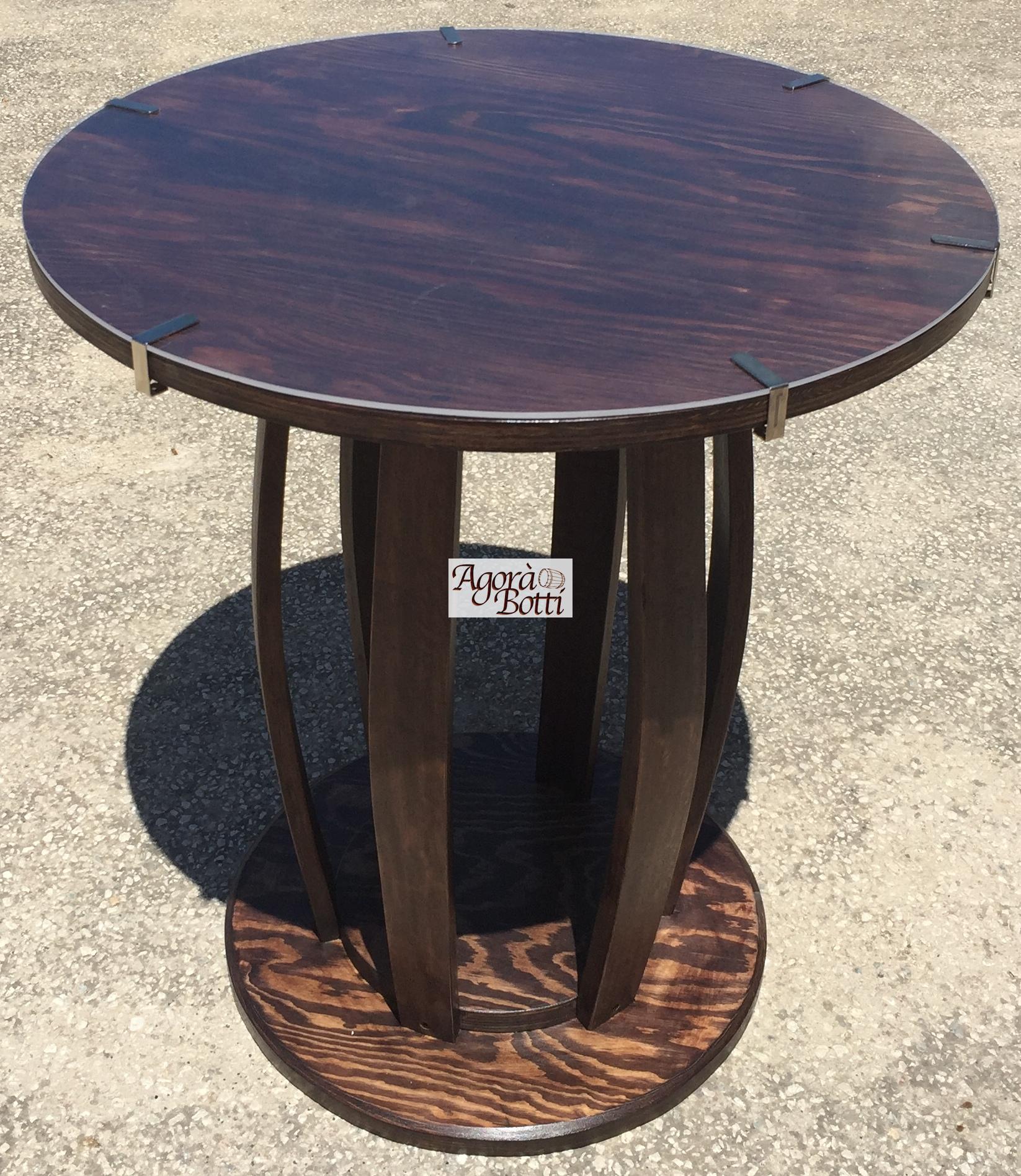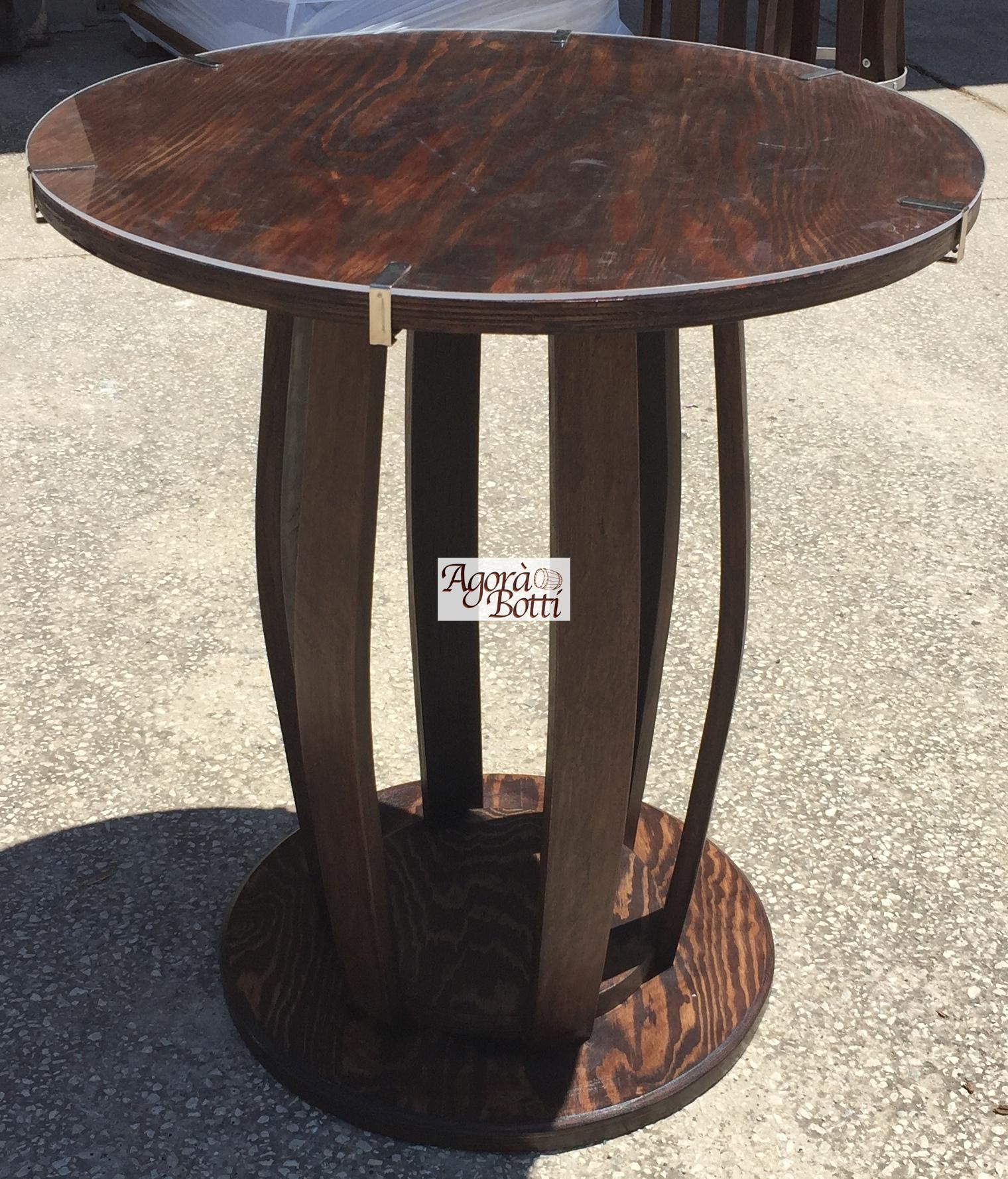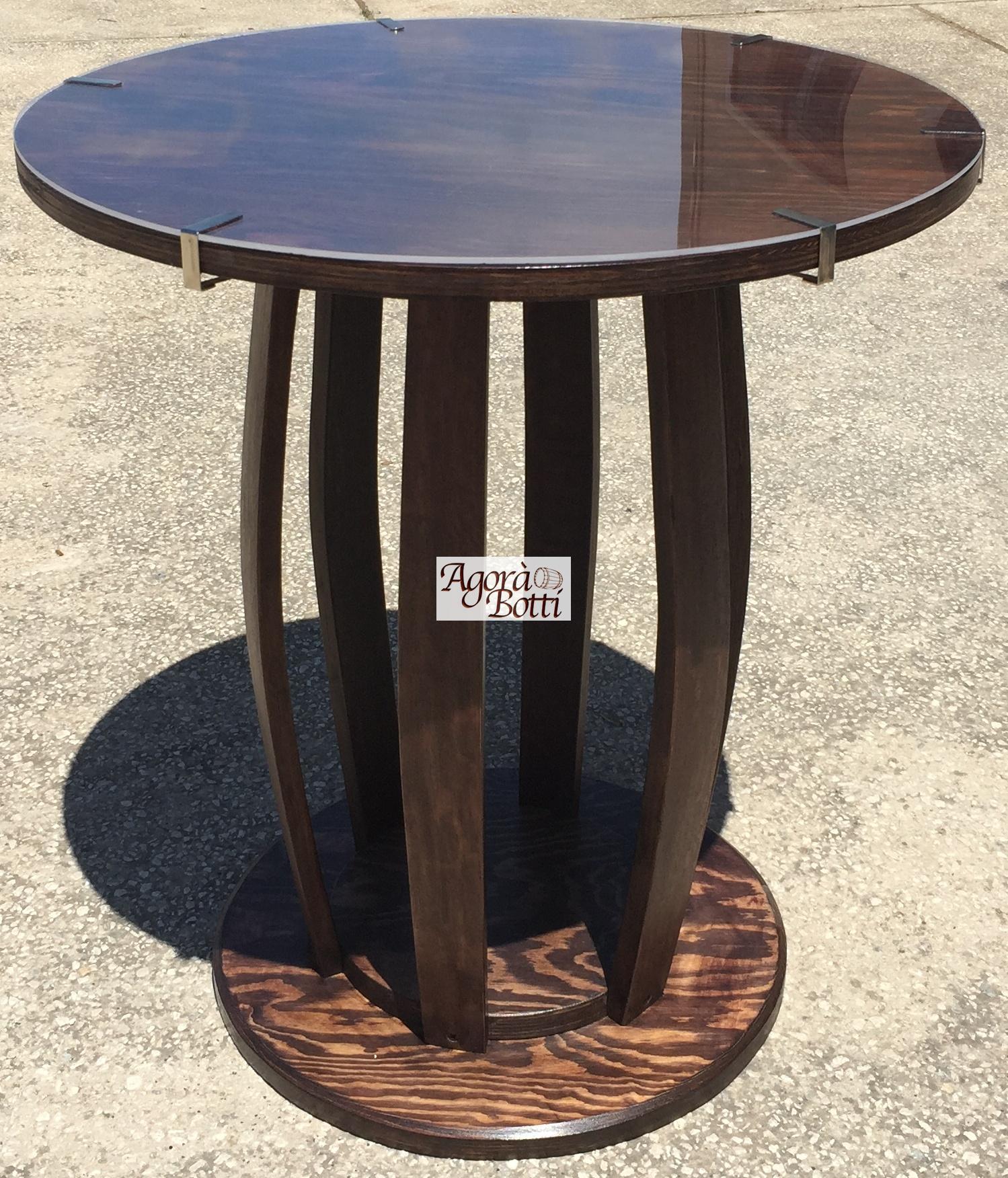 Il tavolo ha un’altezza di 80/85 cm circa e ha un piano d’appoggio in legno con un diametro di 80 cm e uno spessore di 2,5/3 cm sopra il quale è fissato un piano in plexiglass; tutto è trattato con impregnante e finitura all’acqua adatta anche agli ambienti esterni. La struttura è realizzata da una base di legno su cui sono fissate sei doghe di legno di rovere che sostengono il piano superiore.