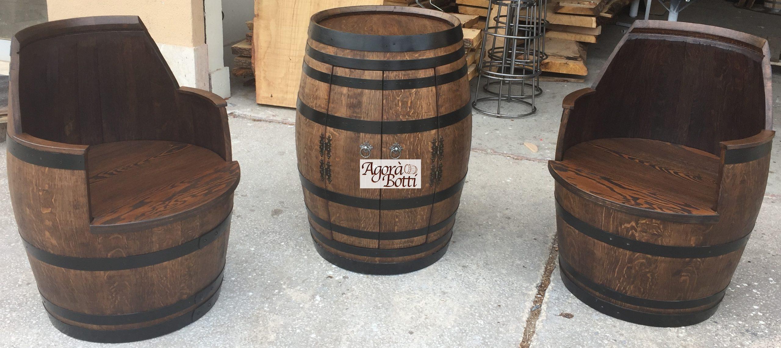 - Le poltrone grandi con braccioli laterali sono ricavate utilizzando barrique da 225 litri di rovere francese; hanno delle sedute facilmente estraibili che consentono di inserire al loro interno oggetti vari.