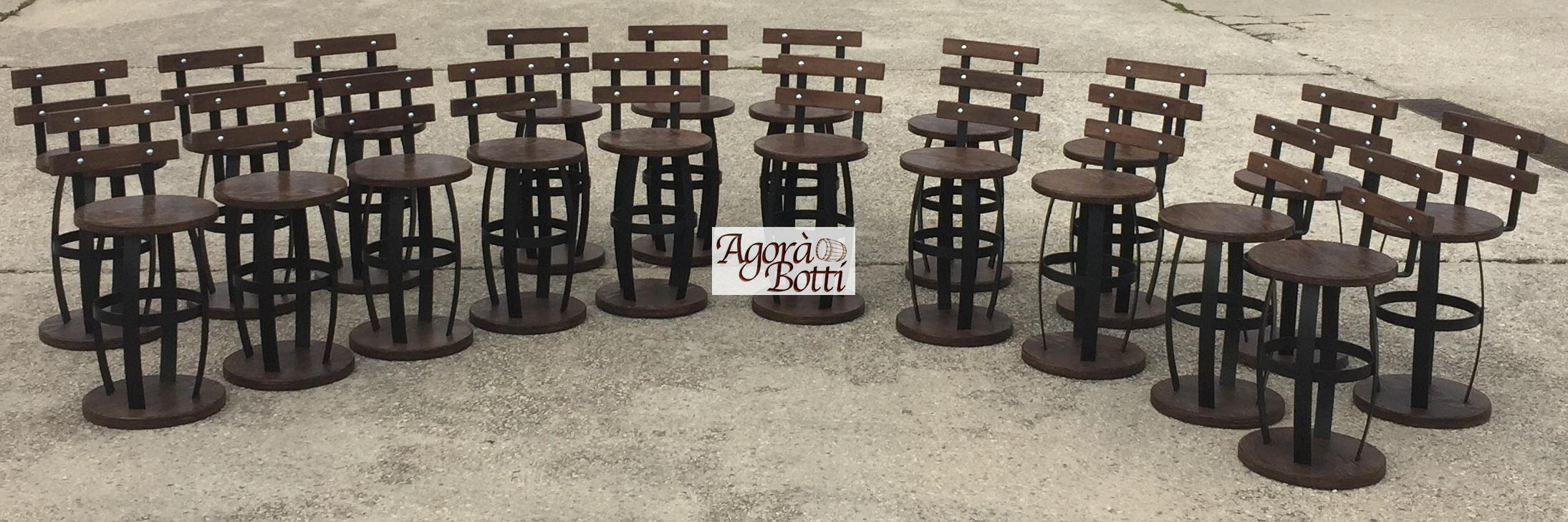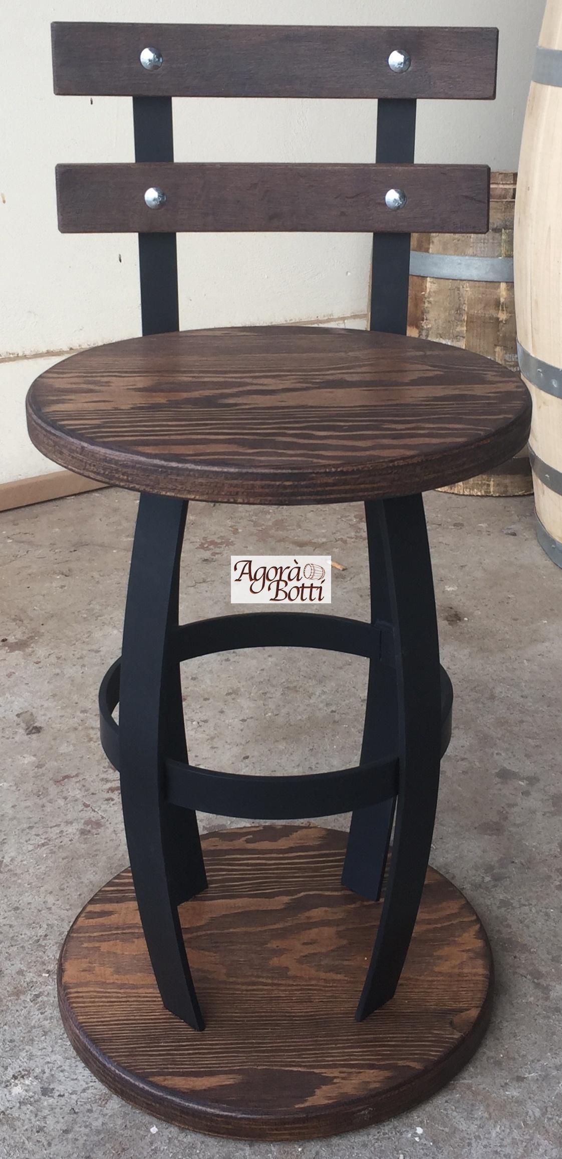 Lo sgabello ha una struttura con assi curvate di ferro zincato che richiamano la forma di una botte, è alto 60/70 cm circa ed è costituito da una base e da una seduta di legno.